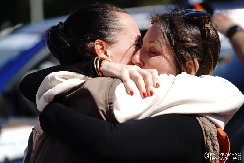 Est-ce l’euphorie du départ ou la bonne nouvelle qui émeut tant Aurore ? Au pied de son 4×4, la binôme de l’équipage 225 est entourée de ses deux filles : l’une, Maylis, qui part avec elle et l’autre, Ophélie, venue lui annoncer sa grossesse. Un cadeau inattendu pour la linguiste d’Aix-en-Provence, qui devient coup sur coup grand-mère et Gazelle : « Je suis exaltée ! Cette aventure va être inoubliable. Ce sont des souvenirs que je vais graver à vie avec Maylis, qui rêvait de partir. » Se faufiler entre les voitures du parking du Nikaïa, à Nice, c’est un peu comme plonger dans une vague d’émotions. Celle des couples qui s’embrassent. Des mères réconfortant leurs enfants. Des corps serrés et des larmes essuyées. « On est là grâce à nos proches, c’est extraordinaire de se sentir entourées comme ça » – confient Fanny et Mathilde, de l’équipage 187 . « Mon fils m’a dit de m’éclater. Je veux lui montrer qu’il faut parfois sortir de sa zone de confort pour vivre de belles choses ».
