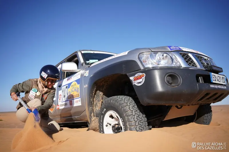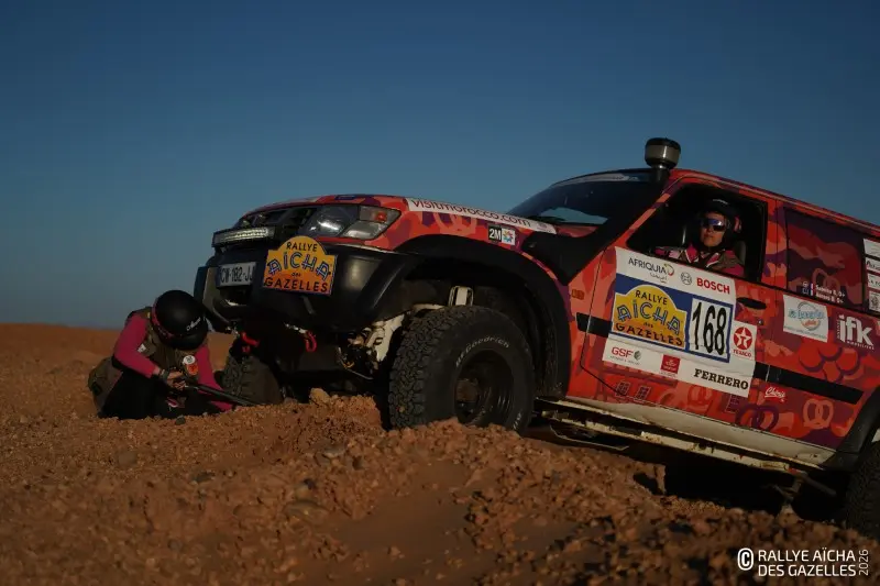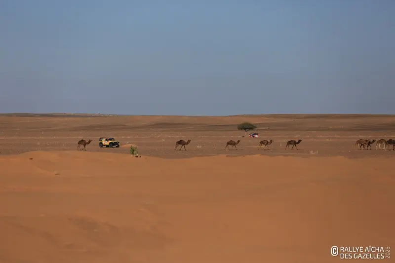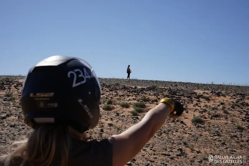 Près du premier CP, les voitures croisent des troupeaux de dromadaires. Ensablé au pied d’un champ de cultures, l’équipage 210 pellette pour la première fois de la matinée. « J’ai complètement mal évalué le chemin : je pensais que la voiture passerait mais c’était trop pointu, on s’est tankées… », analyse après coup Laurie, la navigatrice. Aurélie, sa pilote, prend l’incident avec philosophie : « la règle, c’est de toujours garder sa bonne humeur ! » De loin, les Gazelles peuvent apercevoir les dunes de Merzouga, autrement plus grandes et qu’elles affronteront demain.