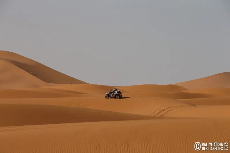 Un cran au-dessus. Ici, les Gazelles doivent franchir les dunes et évoluer ensuite sur des plateaux sableux, avec des passages parfois plus délicats. Certains couloirs entre les dunes se resserrent, rendant la progression plus technique. Ce tracé demande de l’aisance au volant, de l’assurance et une bonne capacité d’adaptation. Une pénalité, plus légère que sur le Z, est également appliquée.