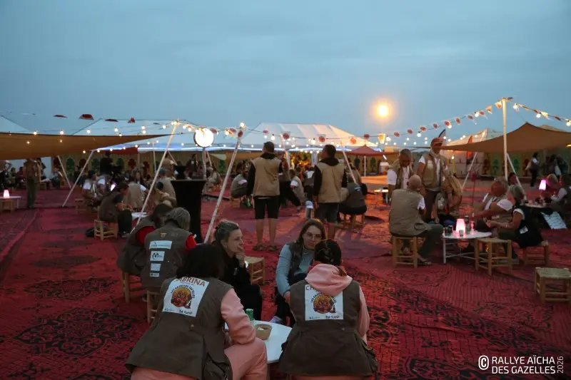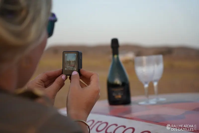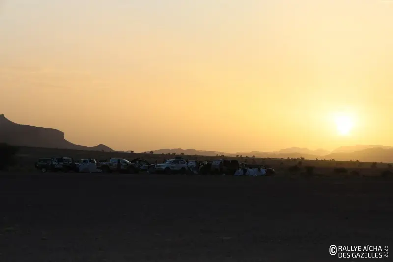 Pour cette soirée d’étape en autonomie, les concurrentes plantent leur tente hors du bivouac. Au soleil couchant du CP 5, l‘équipage 158 , Ophélie et Alexandra, apprécie de voir arriver d’autres participantes. « C’est rassurant de se sentir entourées pour cette nouvelle expérience. » Leur souhait pour la nuit ? « Dormir plus ! » A mi-parcours du Rallye Aïcha des Gazelles du Maroc, la fatigue commence à tirer et le traditionnel réveil de Dominique Serra, la créatrice de la course, ne semble pas manquer aux filles !