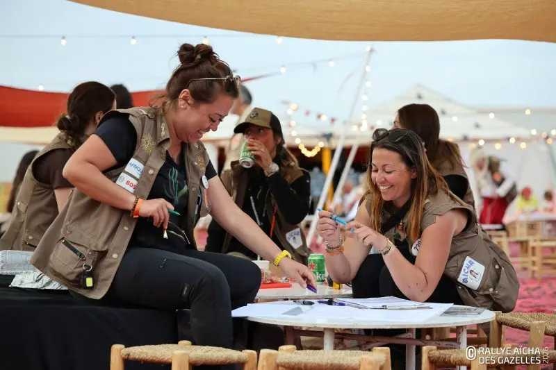 « Bivouaquer ici permet de faire une vraie pause. On est moins speed que sur le campement, on respire », apprécient les anciennes Gazelles de l’équipage 176 Chantal et Carole, de retour pour un deuxième et troisième Rallye des Gazelles. « On a retrouvé d’anciens binômes de notre précédente aventure. Les liens qui se créent entre nous sont très forts. »