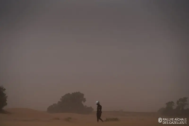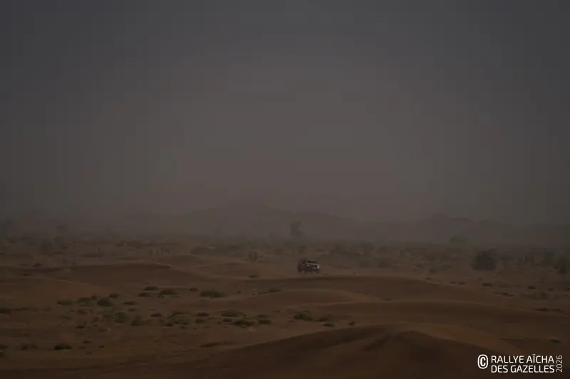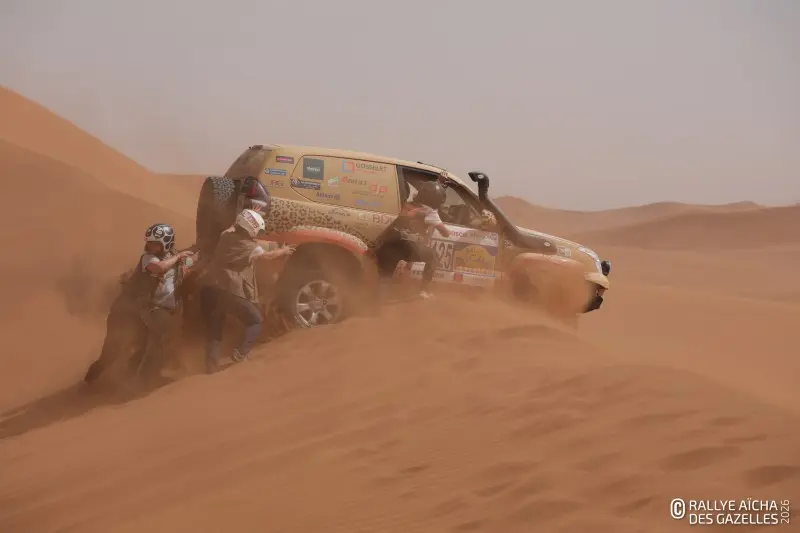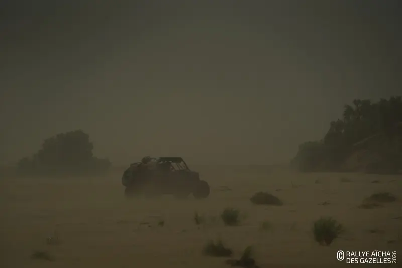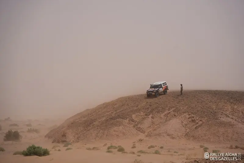Pour d’autres, l’après-midi ressemble à un long chemin de croix. Le vent s’est levé, emportant avec lui la concentration des plus fatiguées. Ici, l’une a perdu son gilet, contenant ses papiers d’identité. Là, un binôme a égaré ses cartes. « Elles sont à l’entrée des dunes, le suivi entre équipages est autorisé. A la sortie par contre, il comptera comme une pénalité. Elles peuvent aussi tenter de redessiner les cartes à la main si elles veulent jouer la gagne », résume Alberto, l’un des pilotes médias. Les rafales compliquent l’exercice. Les nuages bas, les mini tornades, et les buissons secs qui roulent façon western donne à la plaine des airs de fin du monde. « On s’adapte mais c’est difficile. Le sable rentre partout dans l’habitacle… La nuit dans les dunes, ça va être la misère », prédit la team 218 .