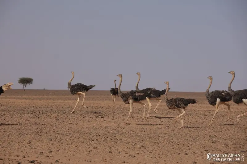Vers l’ouest, le paysage déroule ses pistes de sable et de caillasse. La course a le goût de la poussière. Dans le nez, la bouche, sous les ongles, poussière. Dans l’air, sous les vêtements, poussière. La chaleur grimpe, la route semble interminable jusqu’à ce que … L’équipage 149 s’arrête brusquement. Une erreur de cap leur offre leur premier troupeau d’autruches ! « On en a jamais vu que dans un zoo ou dans un élevage. Regardez les griffes sur les pattes, elles sont énormes ! » Plus loin sur le parcours, c’est une gazelle, une vraie, qui se laisse apercevoir.