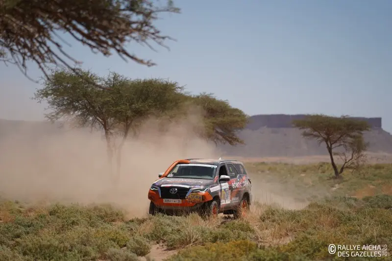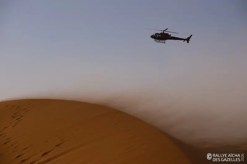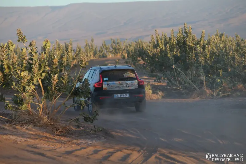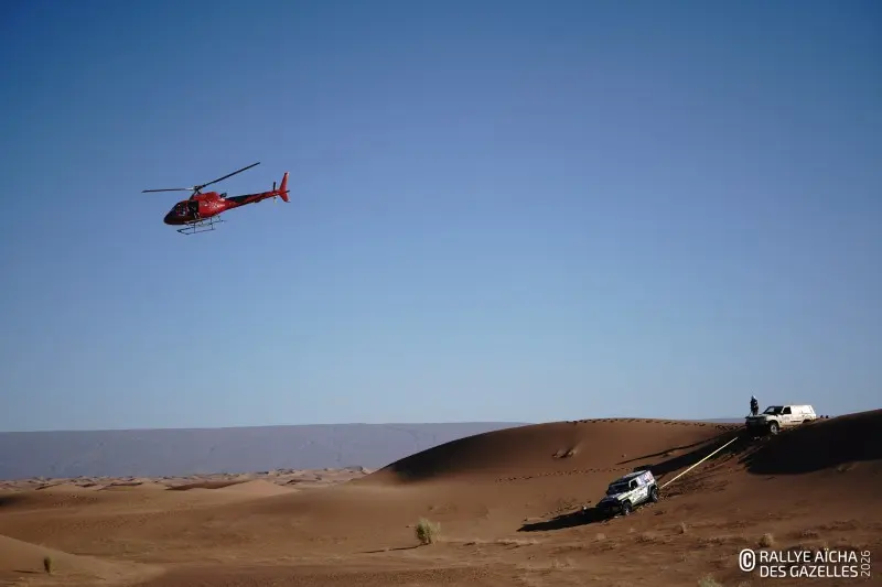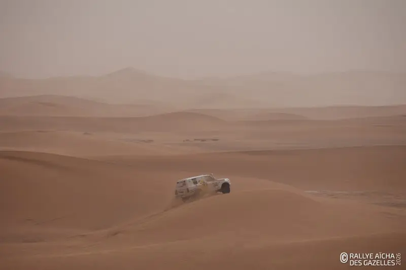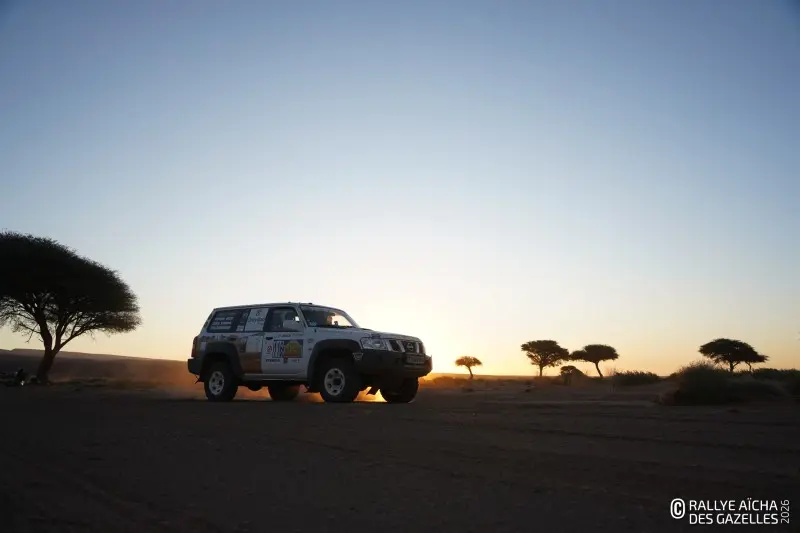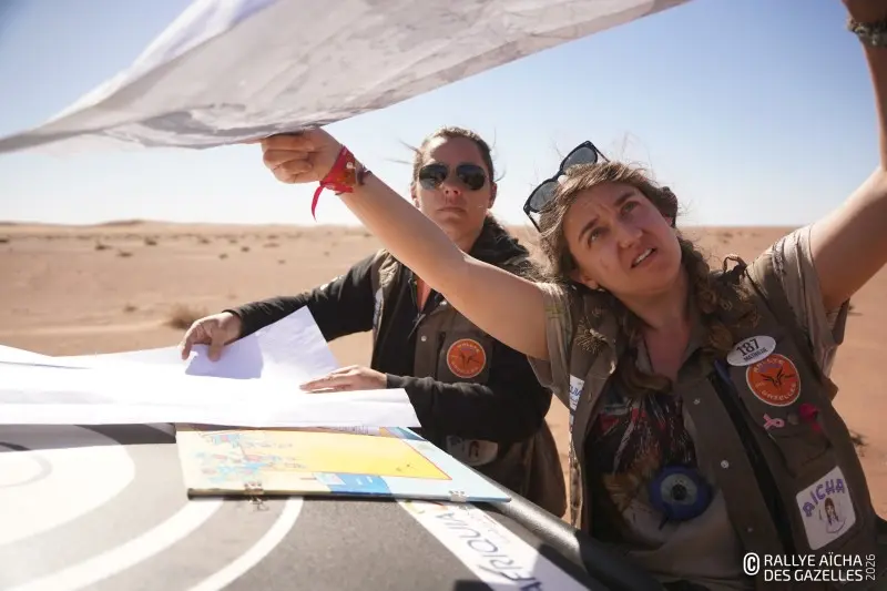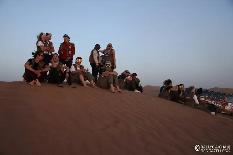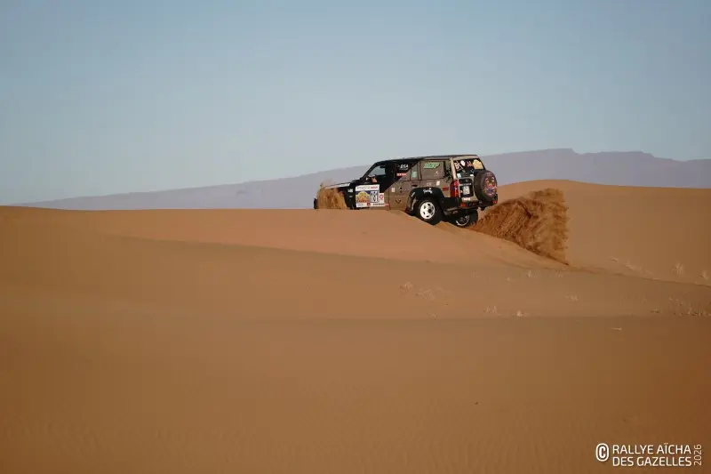 Ce mercredi matin, le soleil rasant dessine les contours du Djebel Bani. En ce septième jour de course, les Gazelles partent pour 230 kilomètres, direction Foum Zguid dans le sud du Maroc. Pour l’équipage 108 , la journée commence par un croisement de ponts dans les creux qui bordent le bivouac – soit deux roues diamétralement opposées décollées simultanément du sol. « Ça va, on a pas pelleté ! » Au premier CP, quelques binômes SSV vérifient ensemble leur cap et les points sur la carte. Anaïs, chirurgien dentaire de la team 40 , est confiante. « La voiture va bien, ma pilote aussi, on va continuer à se concentrer jusqu’au bout. » Ce que la Gazelle redoute le plus, c’est le vent annoncé pour l’après midi. « Avec nos véhicules ouverts, on prend tout dans la figure. Remarque, ça fera un gommage, on aura la peau douce ! »